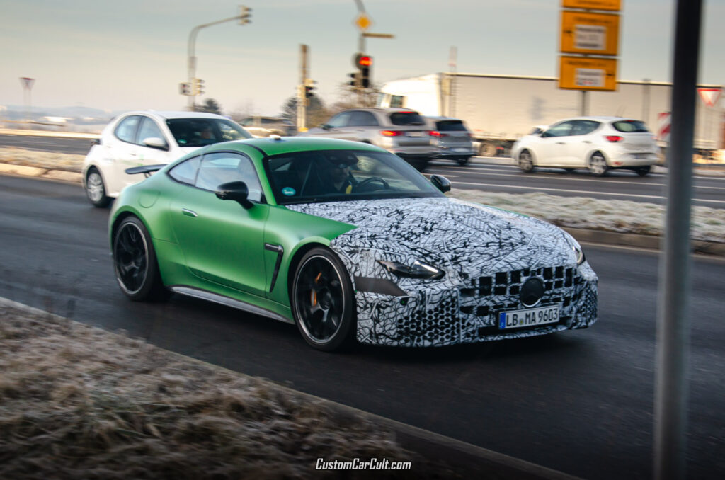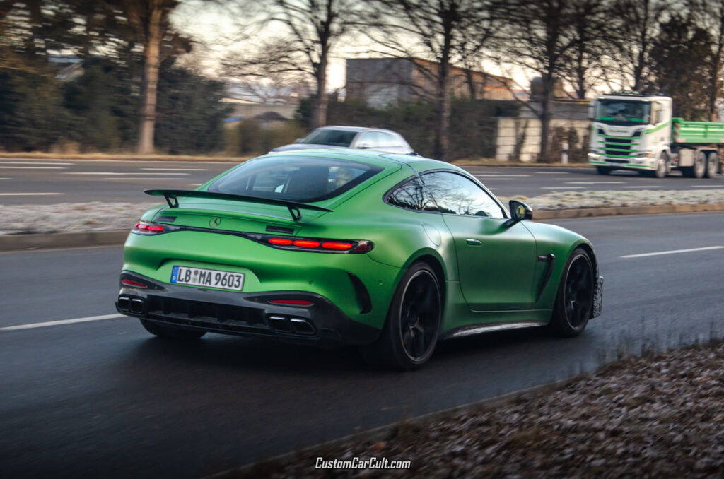 While the front is covered, the rest of the car shows its bare naked ‘Manufaktur AMG Green Hell Magno’ paint. Pieces of black adhesive tape were used to hide the badges in the rear, but the fixed wing and the lack of a charger port in the rear point out this is most likely the new AMG GT 63 Pro, which will set you back at least 206.500 euros, based on prices in the German configurator.